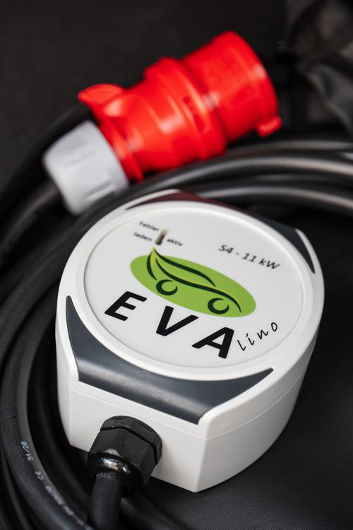 EVAlino kommt mit einem 3P/16A CEE Stecker – dem roten Drehstromstecker. Es liegt zudem ein Adapter auf Schukostecker bei, so dass auch an jeder normalen Steckdose geladen werden kann. Weitere Adapter sind optional erhältlich, je nach Bedarf.